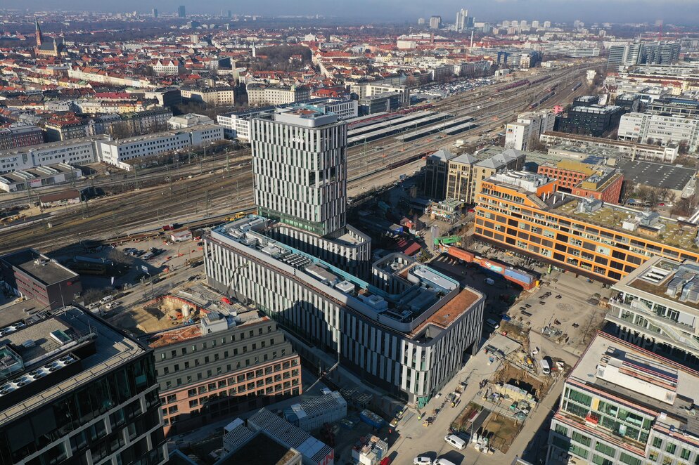Auf dem Werksviertel Areal in München nördlich der Anzinger Straße entstehen zwei moderne Bürokomplexe "Soul" und "Beat". Der Rohbaustart für das…