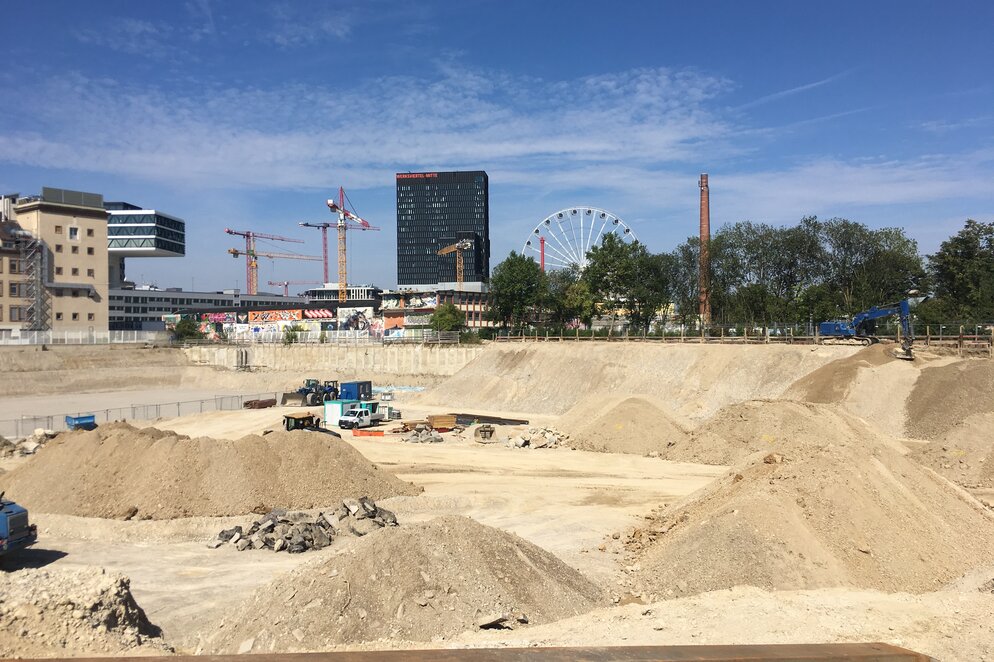 Die Bauarbeiten auf dem ca. 8.500m² großen Grundstück haben kürzlich mit der bis zu 3,0 m dicken Bodenplatte unter dem Hochhaus begonnen.