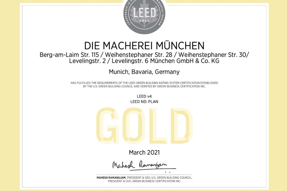 Als erste Quartiersentwicklung in Deutschland hat DIE MACHEREI in München das Nachhaltigkeitszertifikat