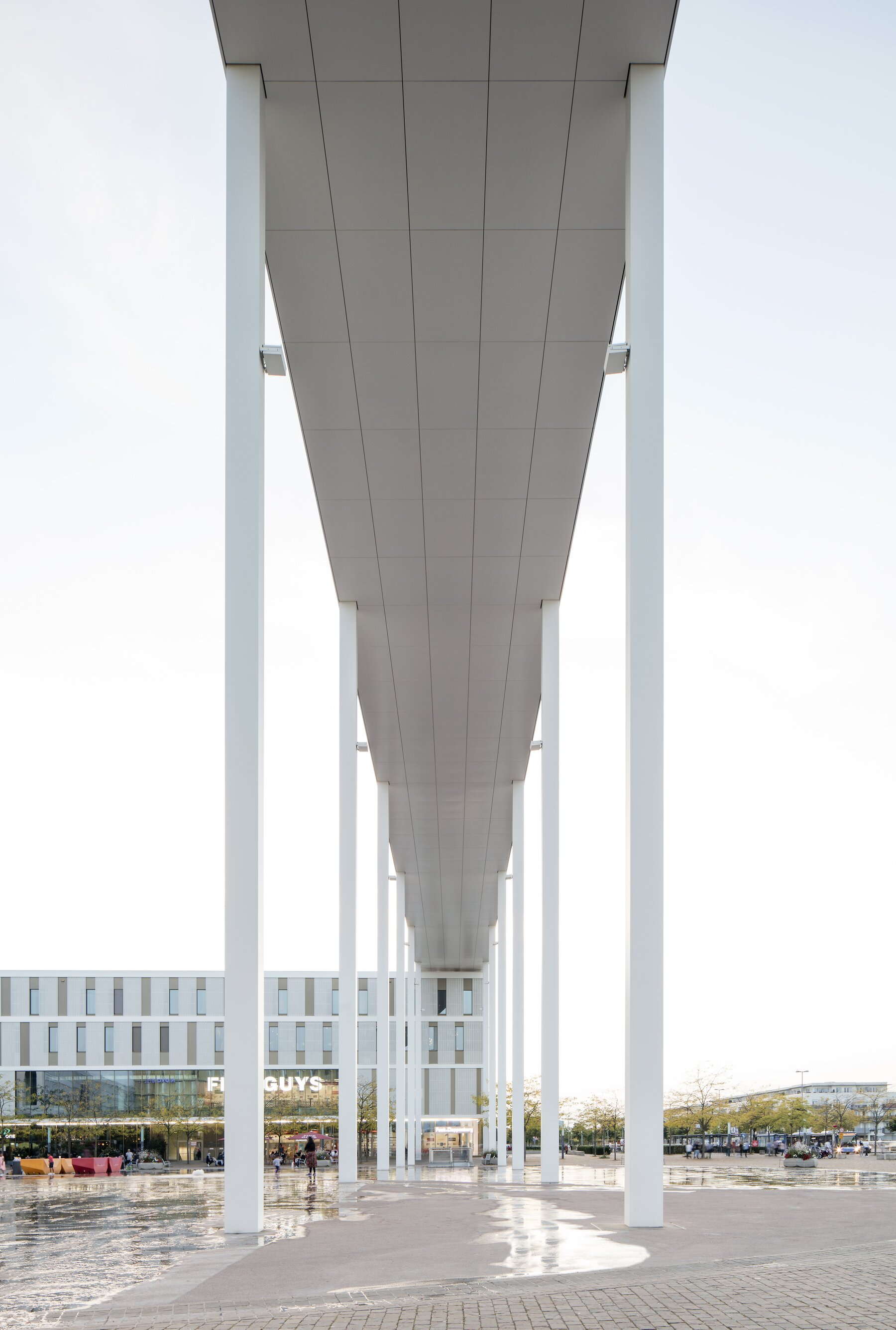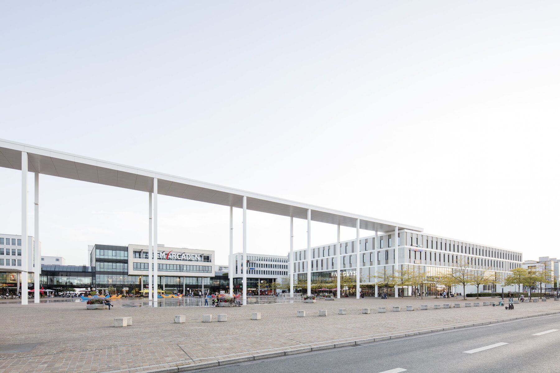 Der städtebauliche Abschluss wird durch einen ca. 150m langen und ca. 22m hohen Portikus in Stahlbauweise hergestellt.