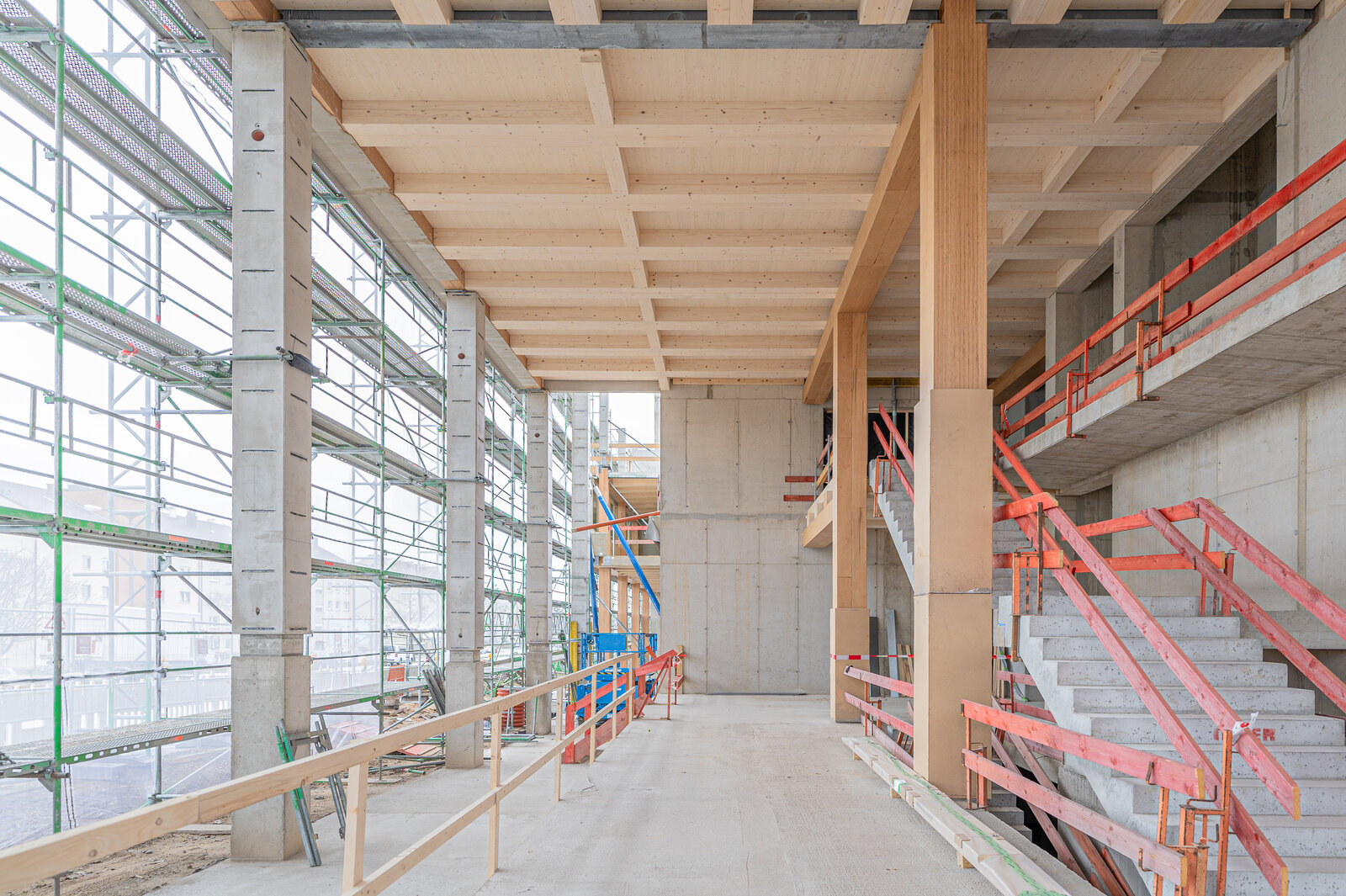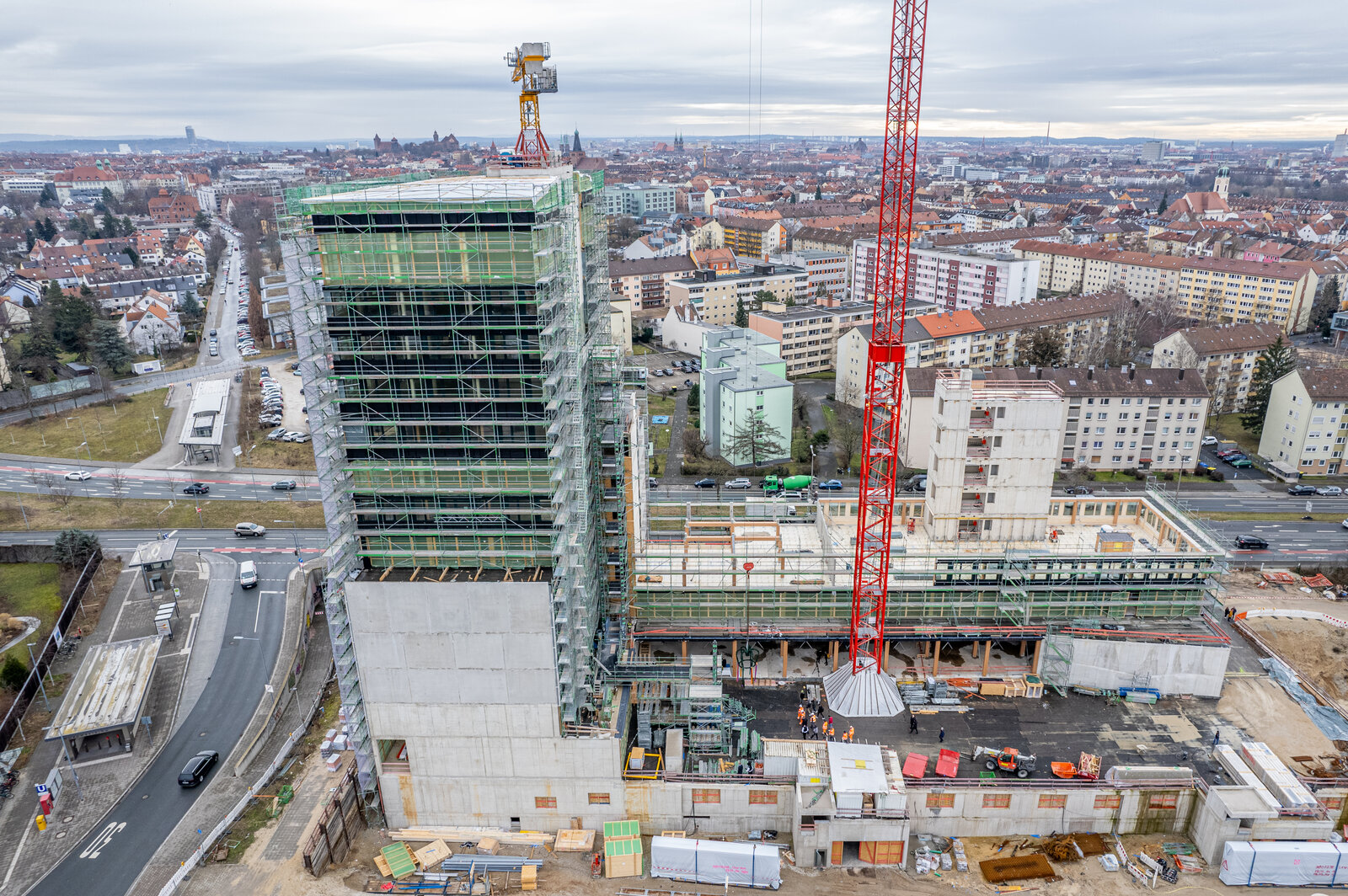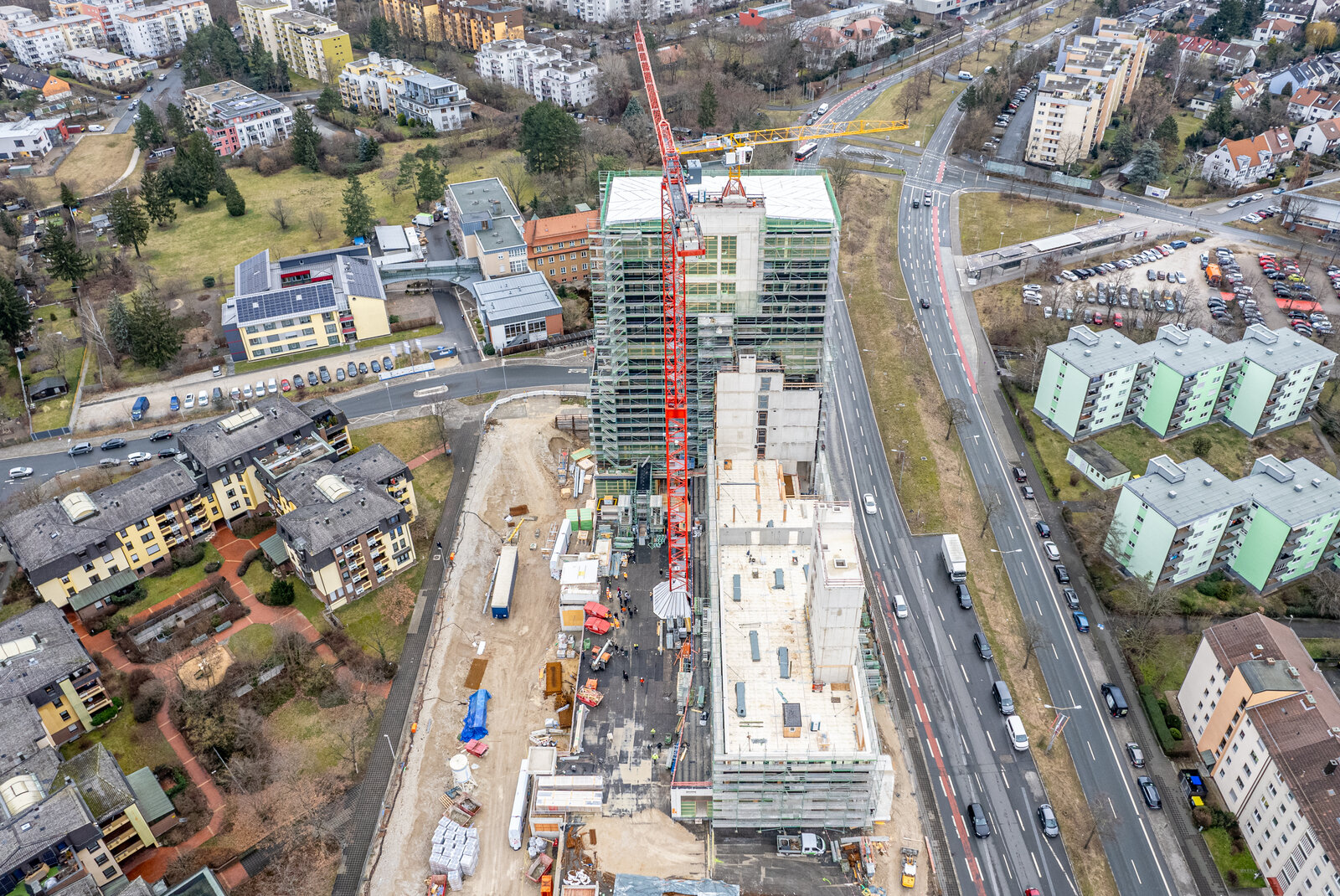 Hochhaus mit 13 Obergeschossen und anliegender Flachbau in Holzhybridbauweise. Aussteifung des fugenlosen Gebäudekomplexes in Massivbauweise. 2 Untergeschosse im Wasser als weiße Wanne. Dieses Projekt wurde in Zusammenarbeit mit merz kley und partner realisiert.
